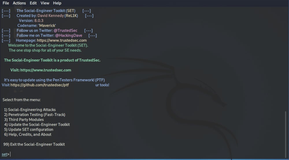 SET, or Social Engineer Toolkit, focuses on the human factor, as scanners won’t do social engineering pentests. Users can create payloads, phishing pages like Google login, and other web attacks.