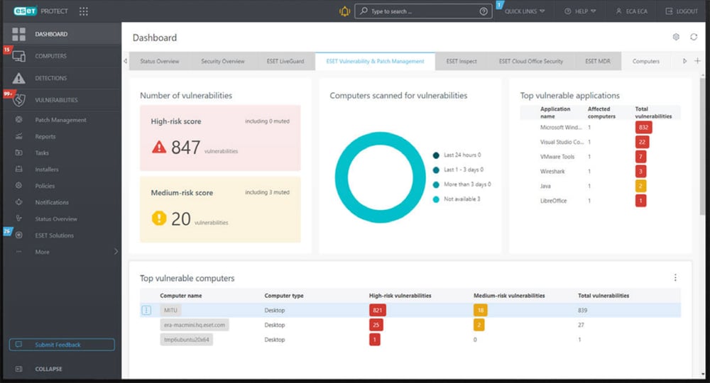 ESET’s vulnerability and patch management dashboard shows your business’s most vulnerable applications.