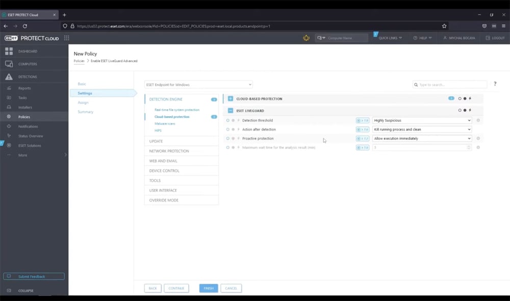 ESET PROTECT allows security admins to create policies that determine how their business handles firewall rules, problematic endpoint devices, and logging. Policies are one of the most useful tools for cybersecurity management because they help teams customize exactly how stringent their security will be. ESET PROTECT supports a variety of policies and lets teams create their own in its web console.