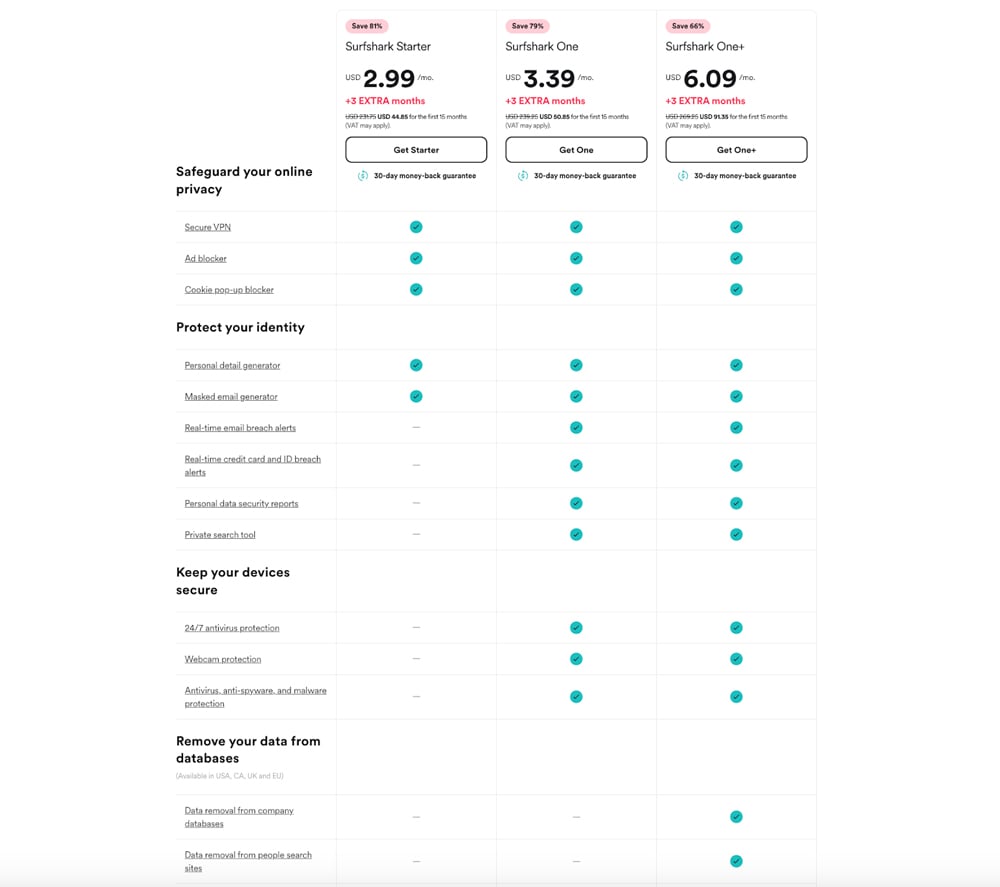Surfshark allows you to purchase one of its 3 plans for 1, 12, or 24 months at a time. Surfshark Starter is the most basic of the three, mostly focusing on VPN functionality with a couple of other features like ad blocking. Surfshark One adds breach alerts, including identity and credit card threats and antivirus and webcam protection. SurfShark One+ is the most full-featured option, and it can remove data from databases and search sites.