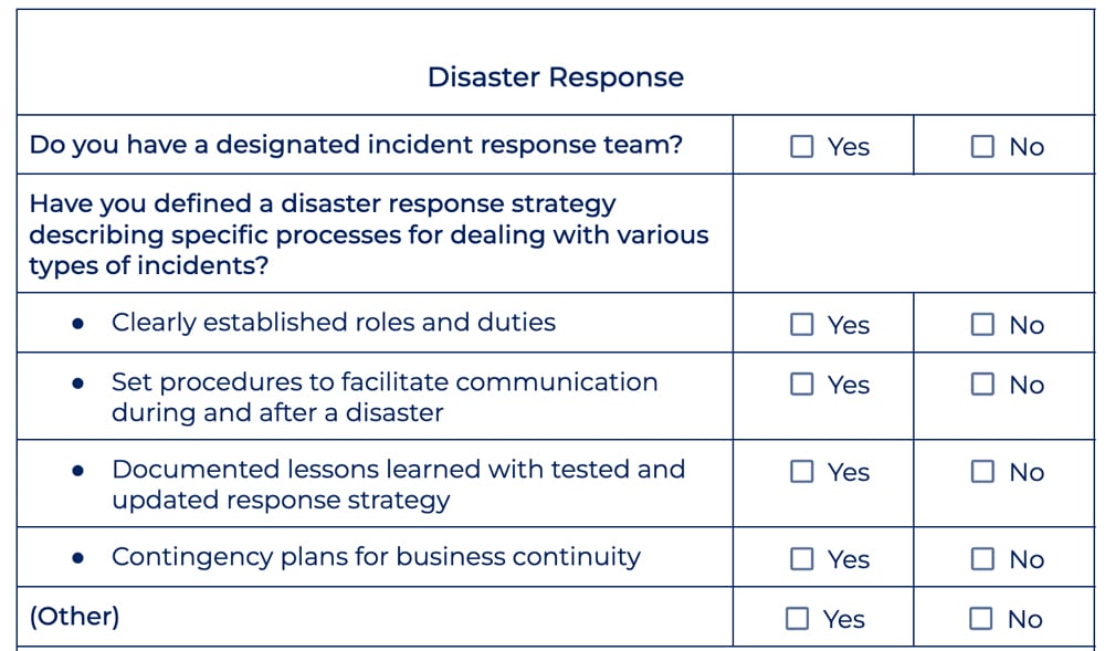 To examine your disaster response preparedness, check the following: