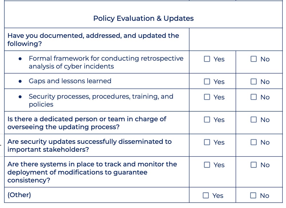 Here’s a snippet of the policy evaluation and updates portion of our checklist:
