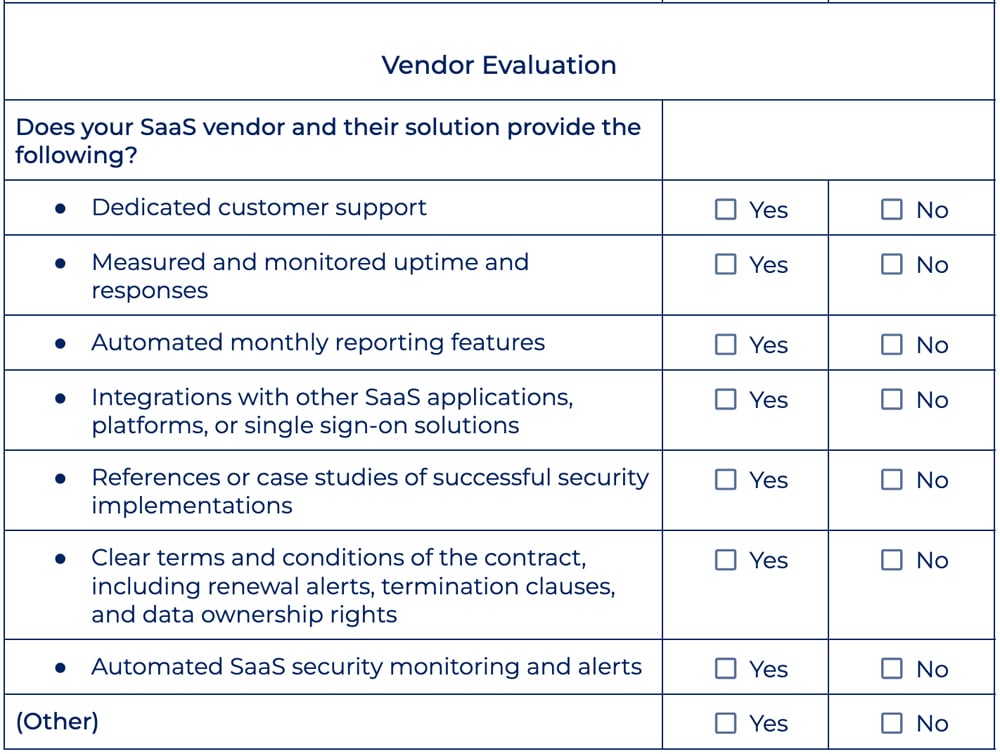 Take a closer look at the SaaS vendor evaluation checklist below: