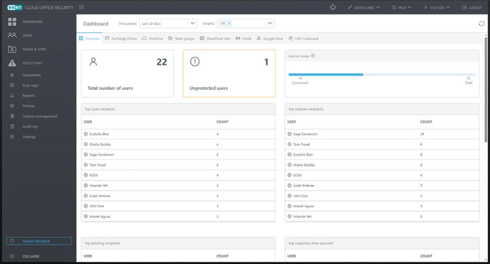 ESET’s Cloud Office Security module offers features like anti-spam, sandboxing, and email and file quarantine for Microsoft 365 and Google Workspace environments. Security teams can view which users receive the most spam emails and malware. ESET also shows teams whether users are unprotected, so they can immediately work with those users. Cloud Office Security can be purchased separately or used as a module within the PROTECT platform.