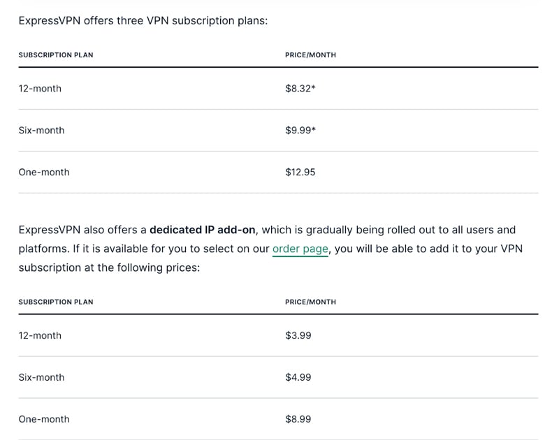 ExpressVPN’s single plan costs $8.32 per month when billed annually. You can also select a six-month billing plan for $9.99 a month or a one-month plan for $12.95, but the annual billing option is the most budget-friendly. ExpressVPN is a bit more expensive than SurfShark, but its extensive features will benefit users with a budget. You can also buy a dedicated IP add-on, which costs $3.99 monthly.