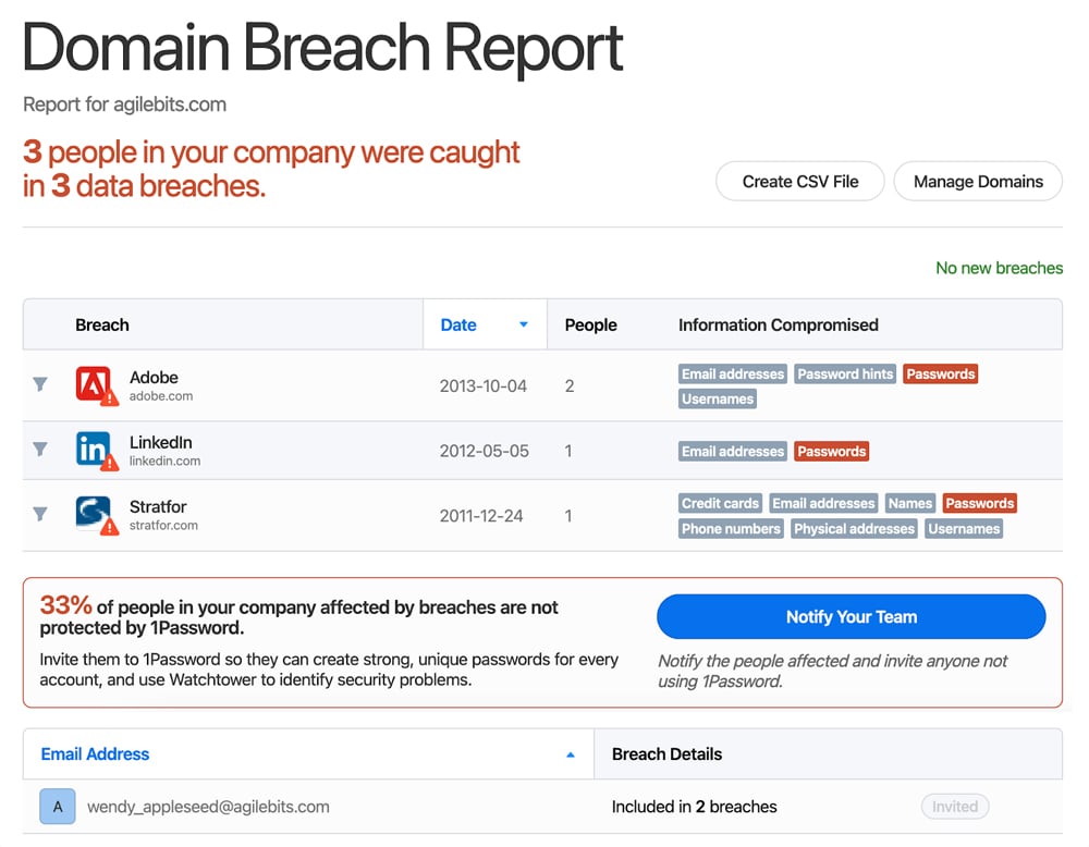 Dashlane has a zero-trust architecture with bank-grade encryption and has never been the victim of a security breach. Users can access the password health dashboard, which analyzes logins and highlights which ones are weak, reused, or compromised. If your business decides to leave the platform, Dashlane allows you to export your data and promises to purge it from their database. While Dashlane does undergo regular third-party audits, it doesn’t provide specifics.