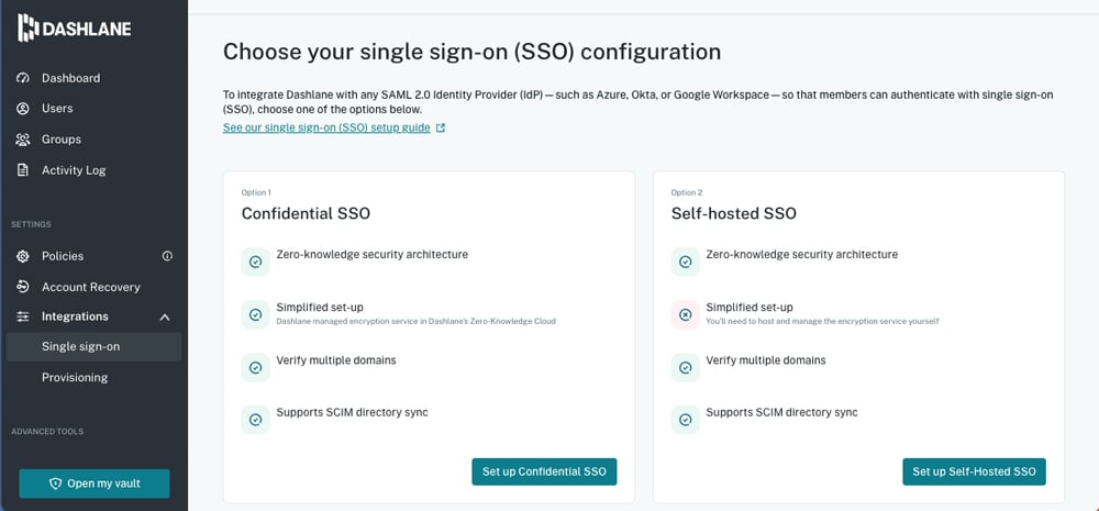 Single sign-on (SSO): Dashlane Business includes its Confidential SSO. Alternatively, you can use a self-hosted SSO.