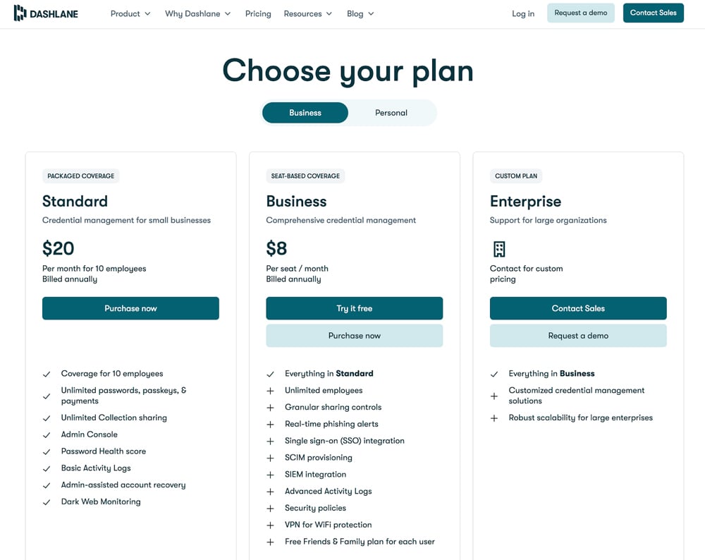 Small teams looking for a solid free or team-based plan: Dashlane eliminated its team plan and only offers one business plan at $8 per user per month. Dashlane Free is incredibly barebones.