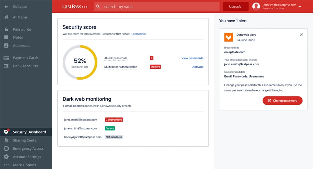 Dark web monitoring: LastPass searches for hashed versions of email addresses for possible breaches and sends a notification if anything has been detected.